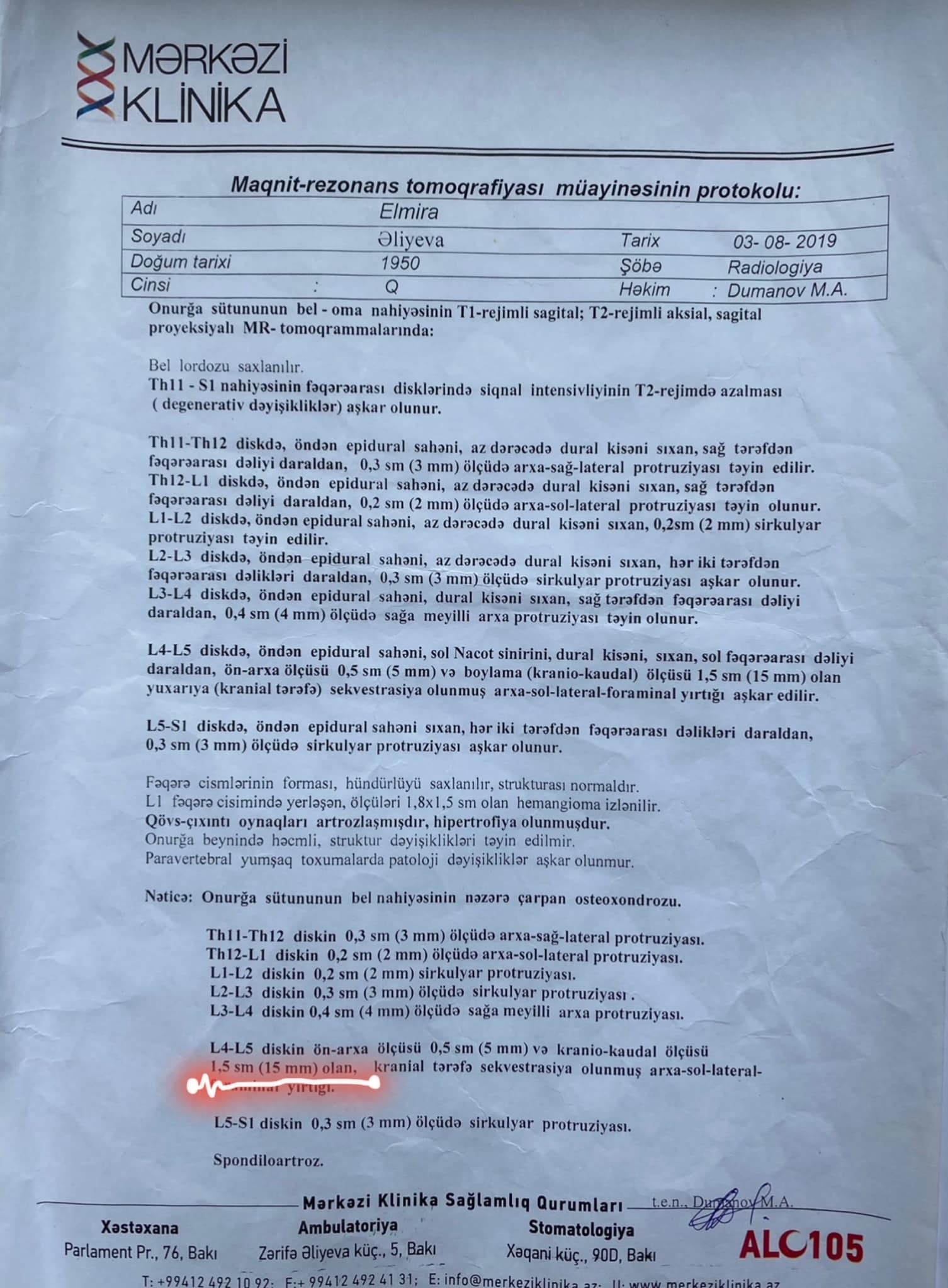 Həkim bildirib ki, gərgin iş qrafiki, saatlarca davam edən əməliyyatlarda uzun müddət ayaqüstə qalmaq məcburiyyətində olan həkimin MRT müayinəsində sekvestrasiyaya uğramış, najot sinirini sıxan 15 mm ölçüdə disk yırtığı aşkar edilmişdir: