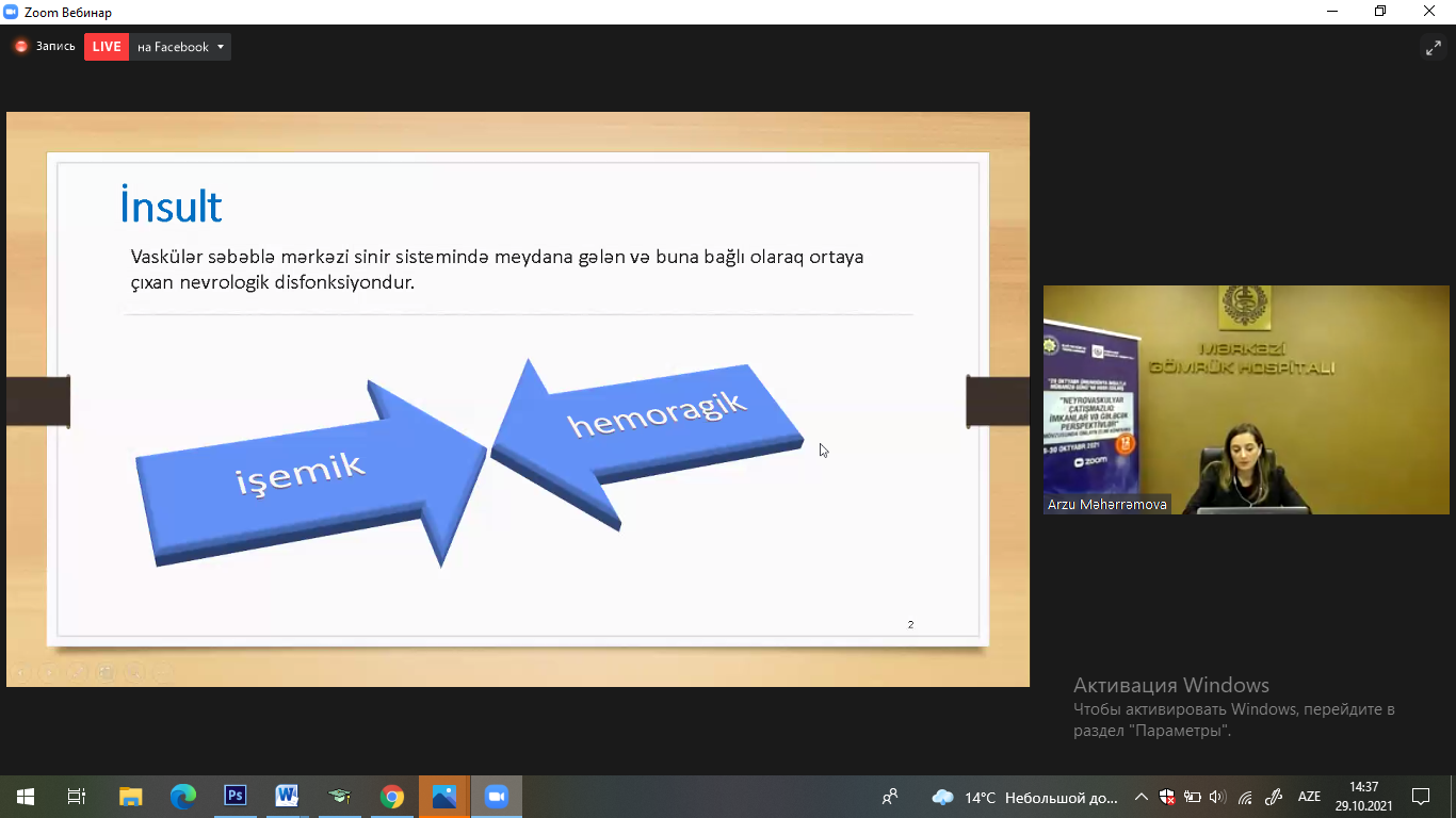 29 oktyabr Ümumdünya İnsultla Mübarizə Gününə həsr edilmiş “Neyrovaskulyar çatışmazlıq: imkanlar və gələcək perspektivlər” mövzusunda onlayn elmi konfrans öz işinə başladı. Tədbir Dövlət Gömrük Komitəsi Tibbi Xidmət İdarəsi Elmi-Təcrübi və Tədris Mərkəzinin və Mərkəzi Gömrük Hospitalının birgə təşkilatçılığı ilə “Zoom” platforması üzərindən keçirilir.