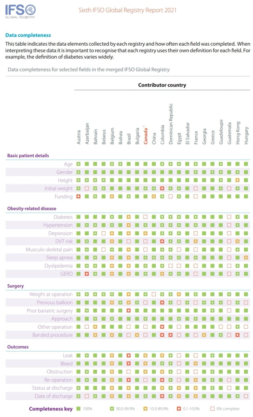 Reyestrdə qeydə alınan əməliyyatların əksəriyyəti sleeve qastrektomiya olub. Bundan sonra Roux en Y, mədə bypass prosedurları daha çox icra edilib. Bu kimi dəqiq və yoxlanılmış dürüstlük əmsalları əsasında ümumilikdə 104 səhifəlik hesabat nəşr olunub.