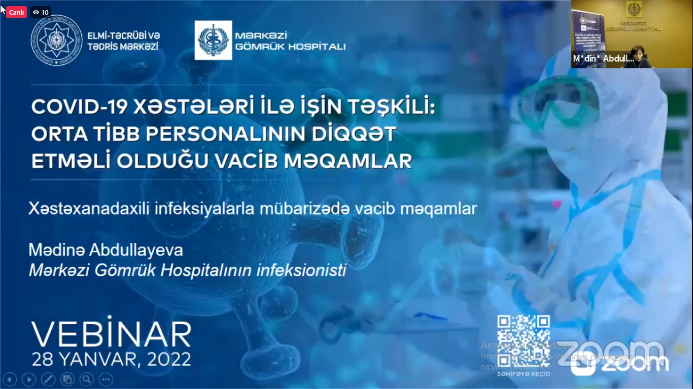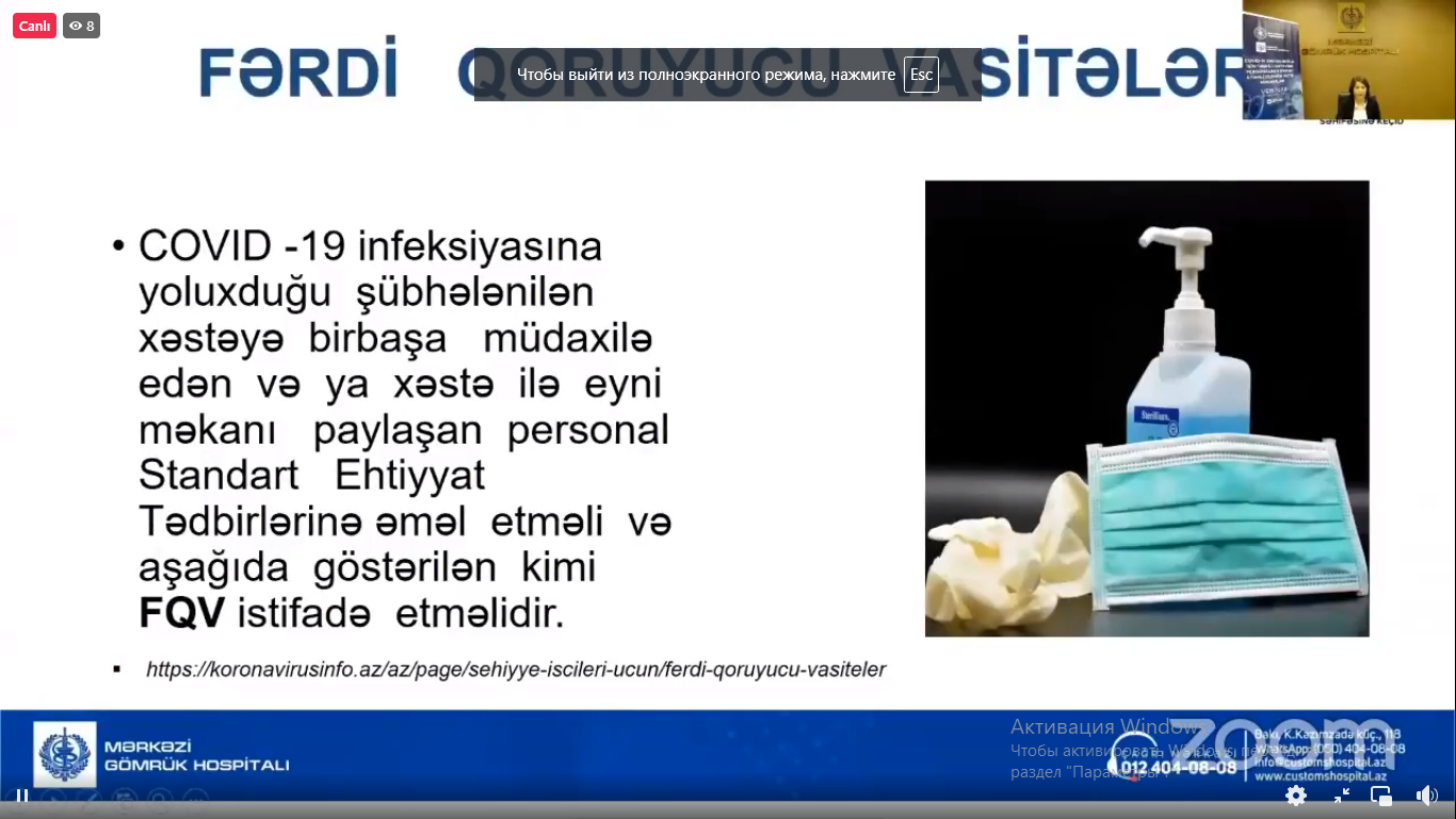 Vebinarda çxış edən Mərkəzi Gömrük Hospitalının baş tibb bacısı, İnfeksiya Nəzarət Komissiyasının üzvü Gülyaz Fərəcova fərdi qoruyucu vasitələrindən (FQV) istifadə ilə bağlı biliklərini bölüşdü. Bildirdi ki, tövsiyə edilən əsas qoruyucu vasitələr əlcək, xalat, tibbi maska, üz qoruyucu, eynək, önlük, kombinezon və sairdir. Koronavirusa yoluxduğu şübhə doğuran xəstəyə birbaşa müdaxilə edən və ya xəstə ilə eyni məkanı paylaşan personal Standart Ehtiyat Tədbirlərinə əməl etməlidir.