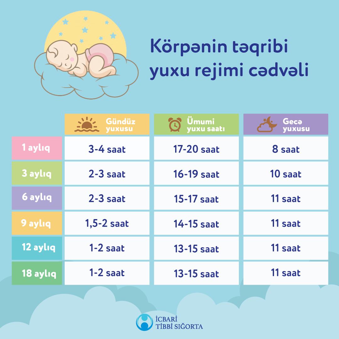 Aztibb.az İcbari Tibbi Sığorta üzrə Dövlət Agentliyinə istinadla körpələrin normal yuxu rejimi cədvəlini təqdim edir: