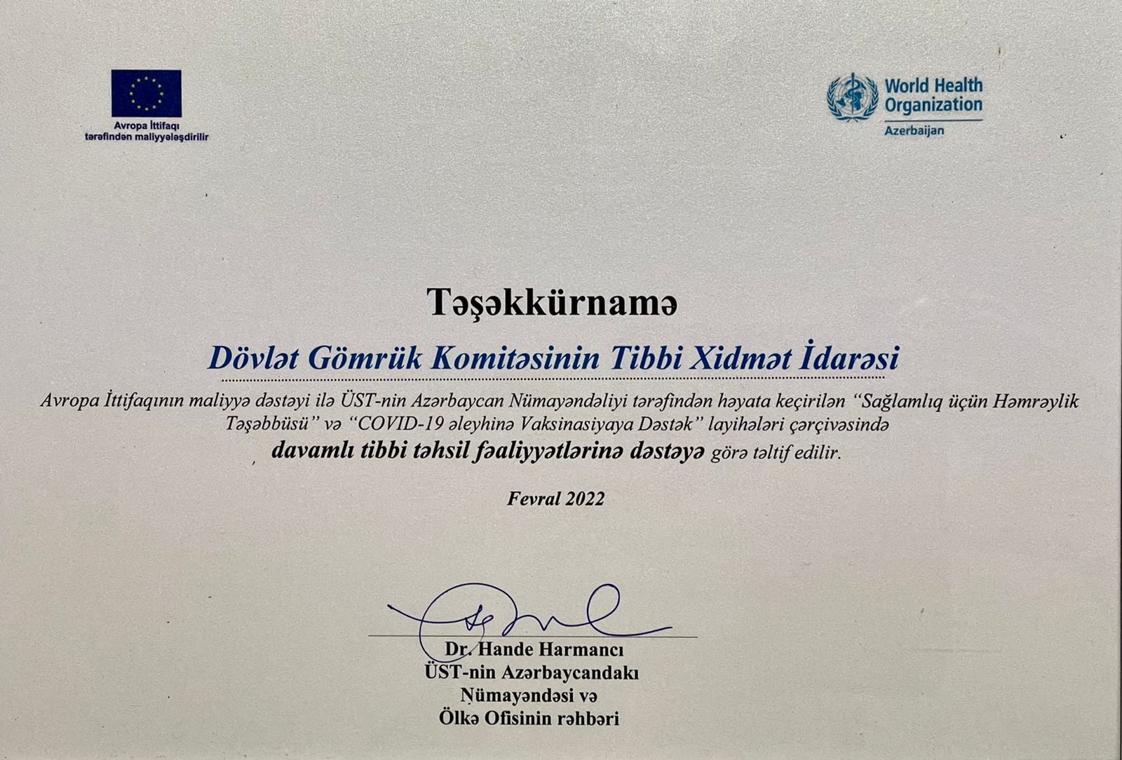 10 fevral 2022-ci il tarixində Ümumdünya Səhiyyə Təşkilatının (ÜST) Azərbaycan nümayəndəliyi tərəfindən “Sağlamlıq üçün həmrəylik təşəbbüsü” və “COVID-19 əleyhinə vaksinasiyaya dəstək” layihələri çərçivəsində 2021-ci ildə görülmüş işlərin yekunlarının təqdimatı və davamlı tibbi təhsil sahəsində seçilmiş tibb müəssisələrinin mükafatlandırılması məqsədilə tədbir həyata keçirilib.