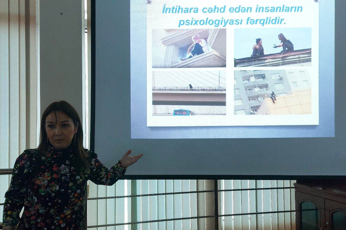 Baş idarənin psixoloqu Sona Məmmədova intiharın mahiyyəti, onun səbəbləri, risk faktorları, növləri, intihara cəhd zamanı ilkin psixoloji yardımın göstərilməsi barədə təqdimat və videoçarx vasitəsilə ətraflı məlumat verib.