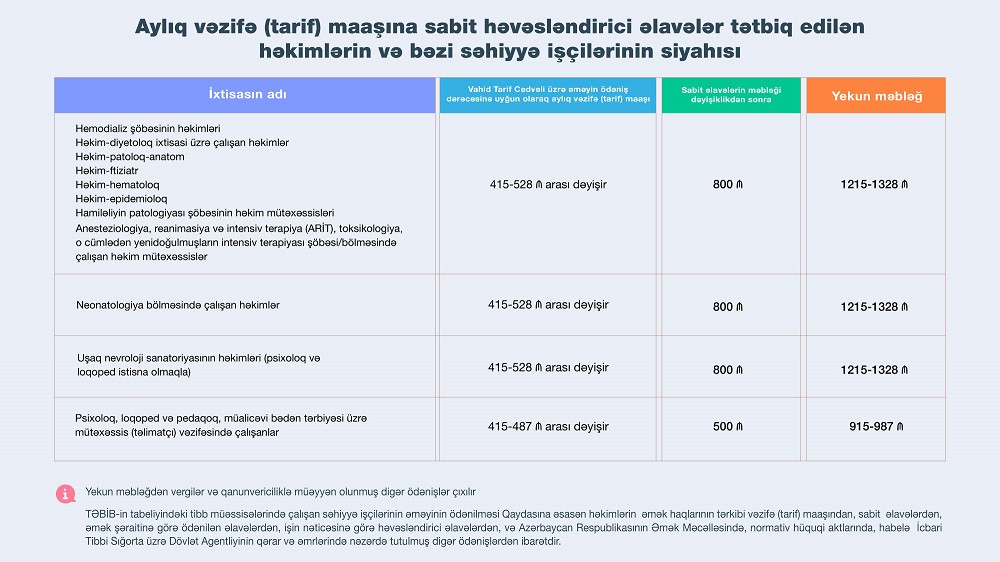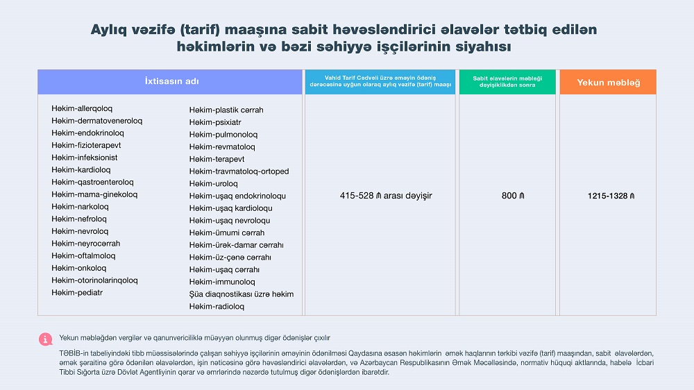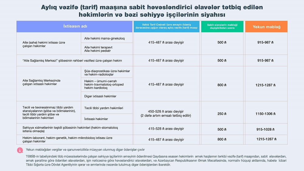 İcbari Tibbi Sığorta üzrə Dövlət Agentliyinin (Agentlik) İdarə Heyətinin qərarı ilə 1 iyun 2022-ci il tarixindən etibarən TƏBİB-in tabeliyindəki tibb müəssisələrində çalışan həkimlərin aylıq vəzifə (tarif) maaşına 800 manat məbləğində sabit həvəsləndirici əlavələr tətbiq olunacaq. Bununla da həkimlərə ödəniləcək əməkhaqqının məbləği vergilər və digər məcburi ödənişlər çıxıldıqdan sonra vəzifə (tarif) maaşı və sabit həvəsləndirici əlavələrlə birlikdə minimum 1000 manat təşkil edəcək.