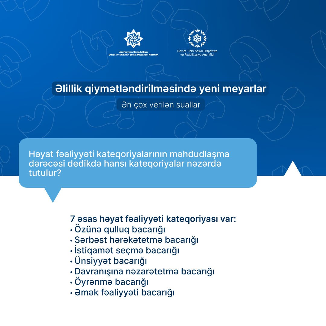 Aztibb.az xəbər verir ki, həmin vaxtdan əlilliyinin qiymətləndirilməsi insanın həyat fəaliyyətinin 7 əsas kateqoriya (özünəqulluq, sərbəst hərəkətetmə, istiqamətseçmə, ünsiyyət, davranışına nəzarətetmə, öyrənmə, əmək fəaliyyəti) üzrə məhdudlaşma faizlərinin müəyyən olunması əsasında həyata keçiriləcək.