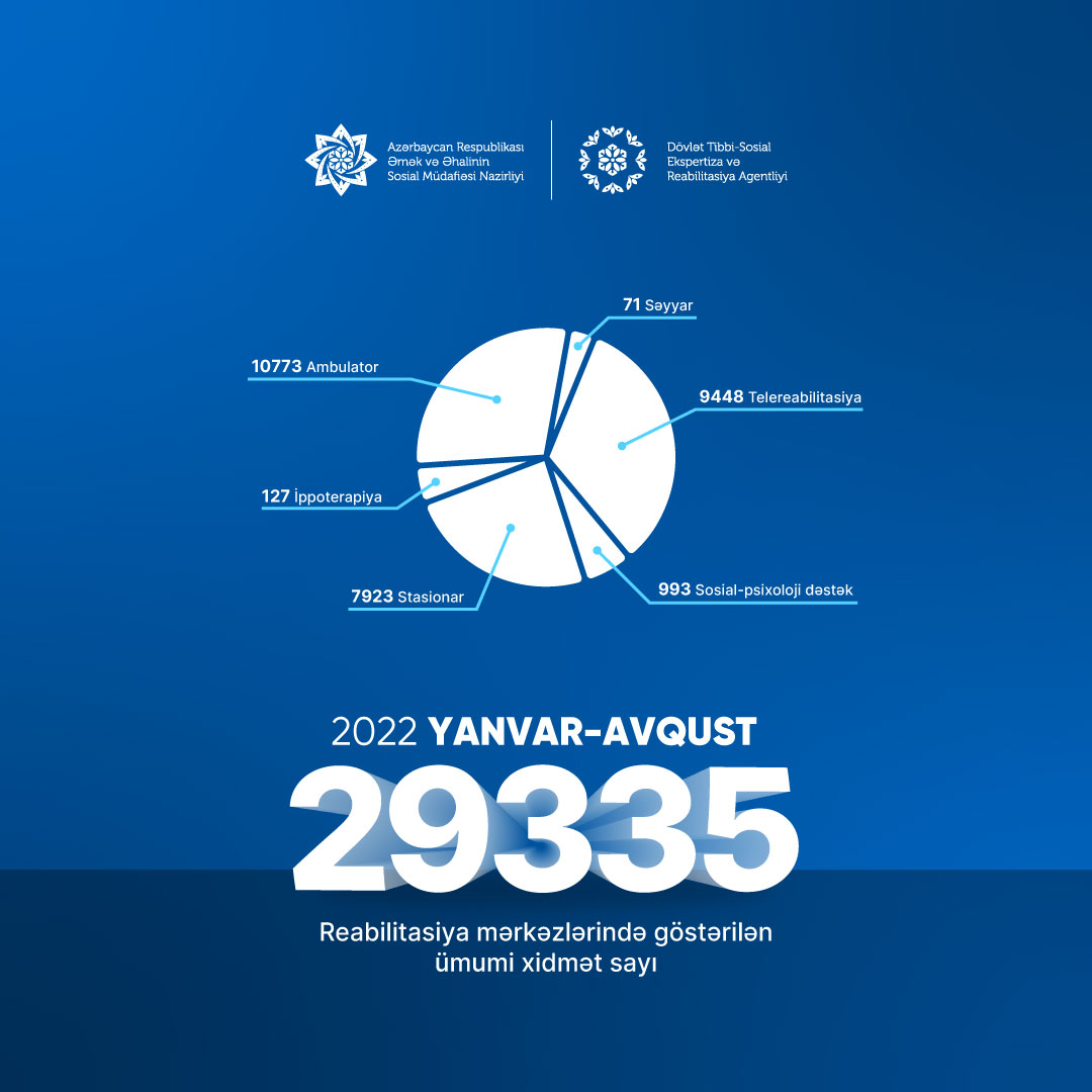 Həmçinin müvafiq dövr ərzində reabilitasiya müəssisələrində 29 min 335 əlilliyi olan şəxsə reabilitasiya xidməti göstərilib.