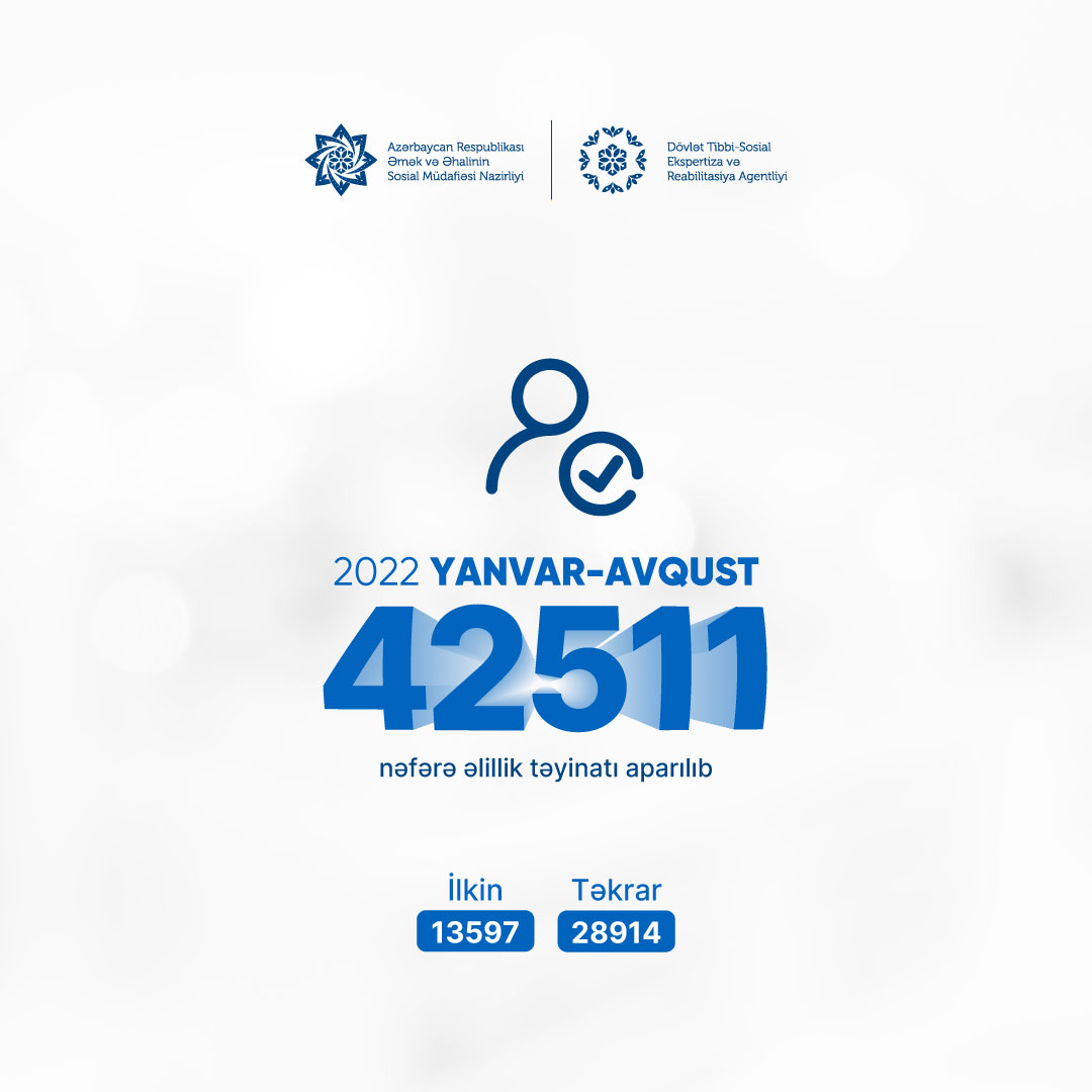 Əmək və Əhalinin Sosial Müdafiəsi Nazirliyinin tabeliyindəki Dövlət Tibbi-Sosial Ekspertiza və Reabilitasiya Agentliyi tərəfindən 2022-ci ilin yanvar-avqust ayları ərzində 42 min 511 şəxsə əlillik təyin edilib.