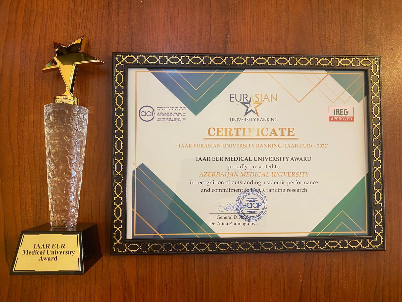 Avrasiya Universitetləri arasında keçirilən “IAAR EUR -2022” reytinqinə yekun vurulub. Akkreditasiya və Reytinq üzrə Müstəqil Agentliyin (Independent Agency For Accreditation and Rating - IAAR) keçirdiyi ekspert qiymətləndirməsinin nəticələrinə əsasən, Azərbaycan Tibb Universiteti qaliblərdən biri olub, İİAR-ın Avrasiya tibb universitetləri arasında ilk üçlükdə yer alıb. ATU rəsmi olaraq Beynəlxalq Akkreditasiya və Reytinq Agentliyi yüksək akademik nailiyyətləri və IAAR reytinq araşdırmalarının aparılmasına qatılaraq, qətiyyətli dəstək nümayiş etdirdiyinə görə Azərbaycan Tibb Universiteti “İAAR Avrasiya Tibb Universiteti” mükafatına layiq görülüb.