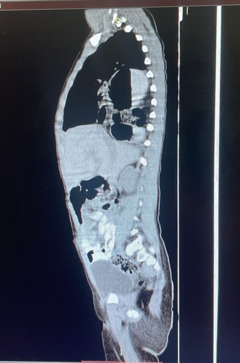 Uşağı bu vəziyyətə salan səbəb diafraqmada olan böyük defektdən mədənin və bağırsaqların döş qəfəsinə keçməsi (Paraözofagial diafraqma yırtığı) olub.