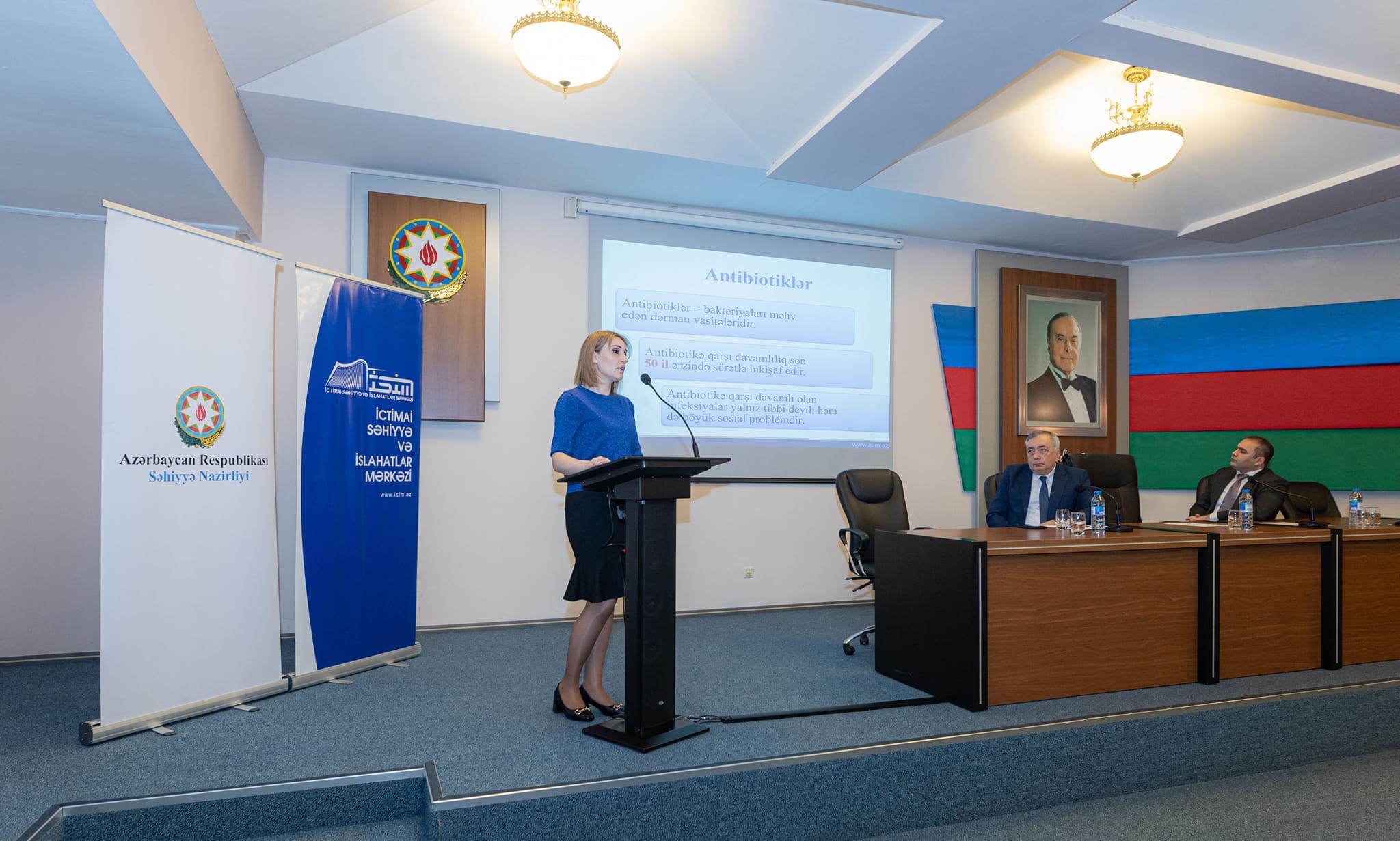 Tədbirdə İSİM-in Monitorinq və təhlil şöbəsinin həkim-metodisti Zümrüd Kazımova “Antibiotiklərə rezistentlik: qlobal çağırışlar və milli tədqiqatın nəticələri” mövzusunda təqdimatla çıxış edib. Məruzəçi qeyd edib ki, ölkəmizdə antibiotiklərdən lazımi şəkildə istifadə etməklə onların effektivliyinin qorunub saxlanması və onların qəbulunun yalnız ixtisaslaşmış səhiyyə mütəxəssisi tərəfindən təyin edilməsinə nail olmaq məqsədilə İSİM ÜST-ün dəstəyi ilə əhali arasında geniş maarifləndirmə və təbliğat işlərini həyata keçirir: “Antibiotiklərlə bağlı əhalinin məlumatlılıq səviyyəsini öyrənmək məqsədilə 2018-2022-ci illərdə sorğu keçirilib. Sorğuda insanların mövzuya dair bilik səviyyəsi müəyyən edilib və eyni zamanda, bu sahədə qabaqcıl təcrübəyə əsaslanan məlumatlar əhalinin nəzərinə çatdırılıb”.