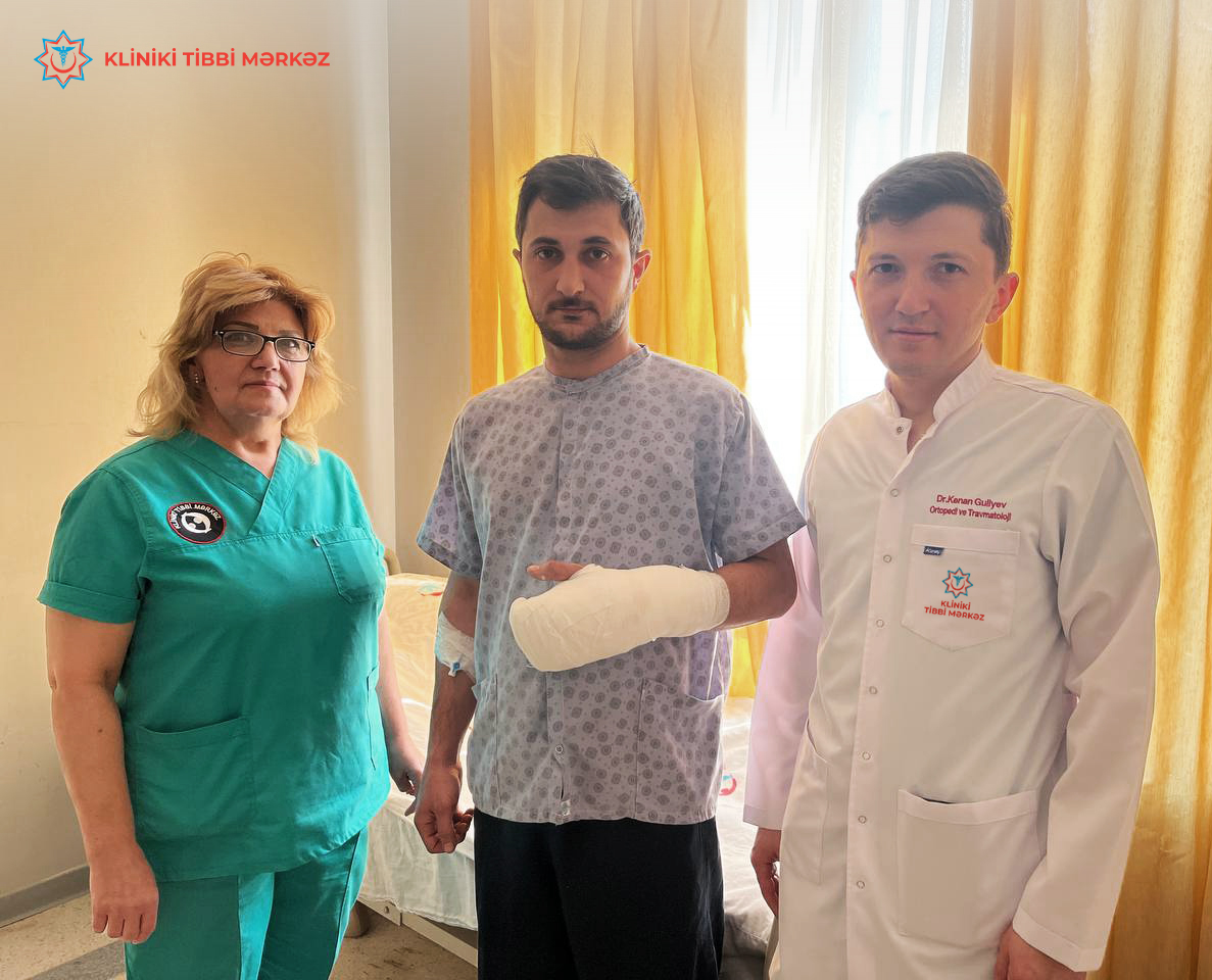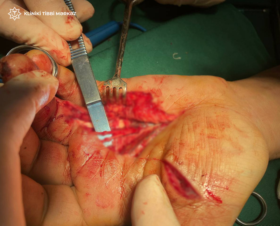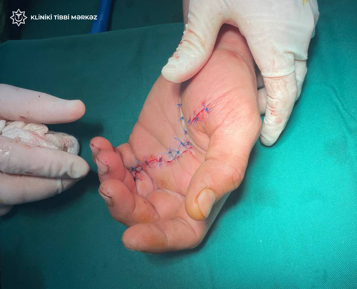 Həkim bildirib ki, fevralın 20-də iş qəzası nəticəsində sol əlin ovuc səthində kəsilmiş yara ilə Kliniki Tibbi Mərkəzə müraciət edən pasiyentə sol əlin 4-cü barmağın dərin və səthi bükücü vətərlərinin, 3-cü və 4-cü barmaqların digital sinir və arterlərin kəsilməsi diaqnozu qoyulub və ona təcili əməliyyat təyin edilib. 2 saat 40 dəqiqə davam edən əməliyyat uğurla nəticələnib.