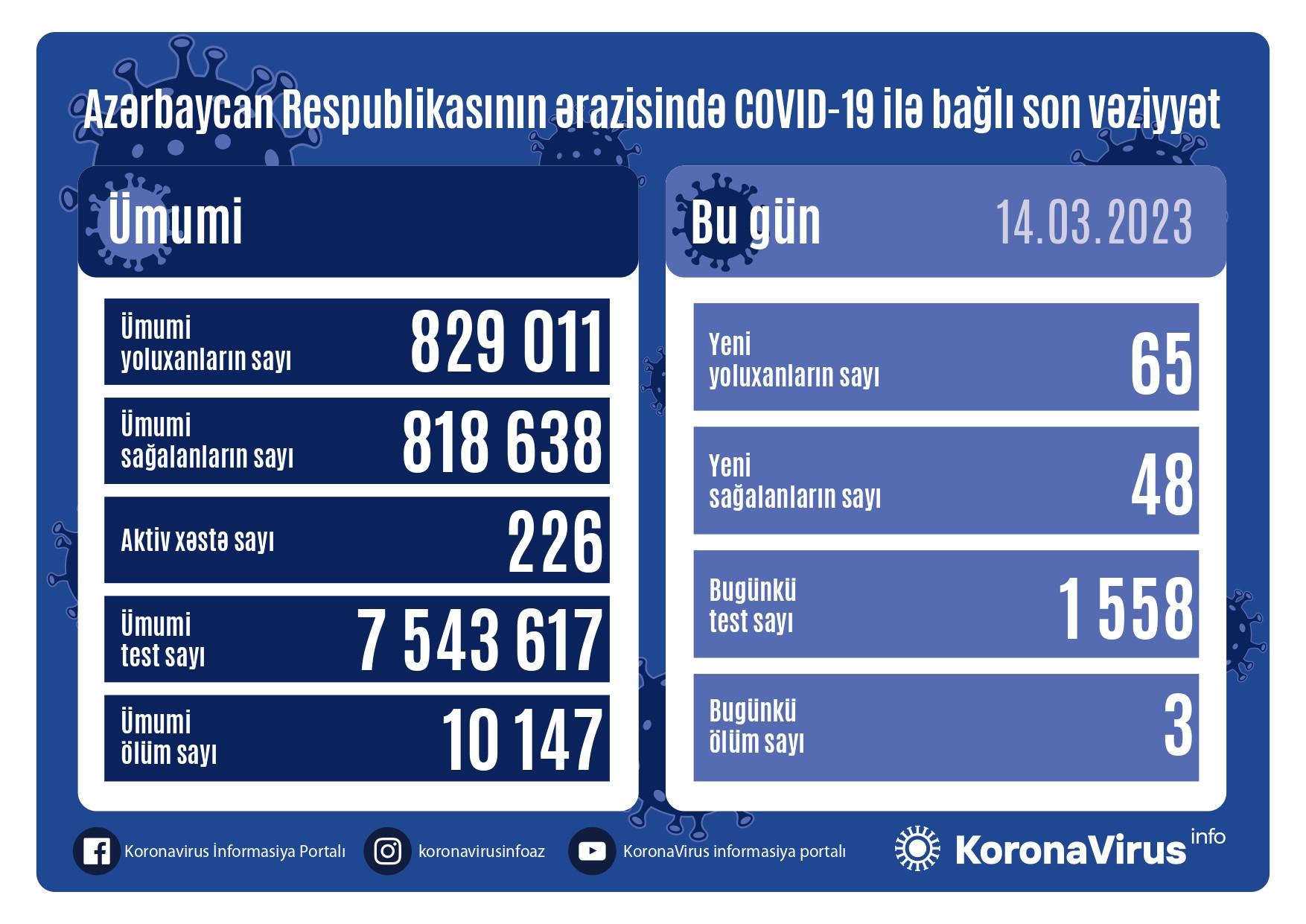 İndiyədək Azərbaycanda ümumilikdə 829 011 nəfərin xəstəliyə yoluxması faktı müəyyən edilib, onlardan 818 638 nəfər müalicə olunaraq sağalıb, hazırda 226 aktiv xəstə var. Bu günə qədər 10 147 nəfər vəfat edib.