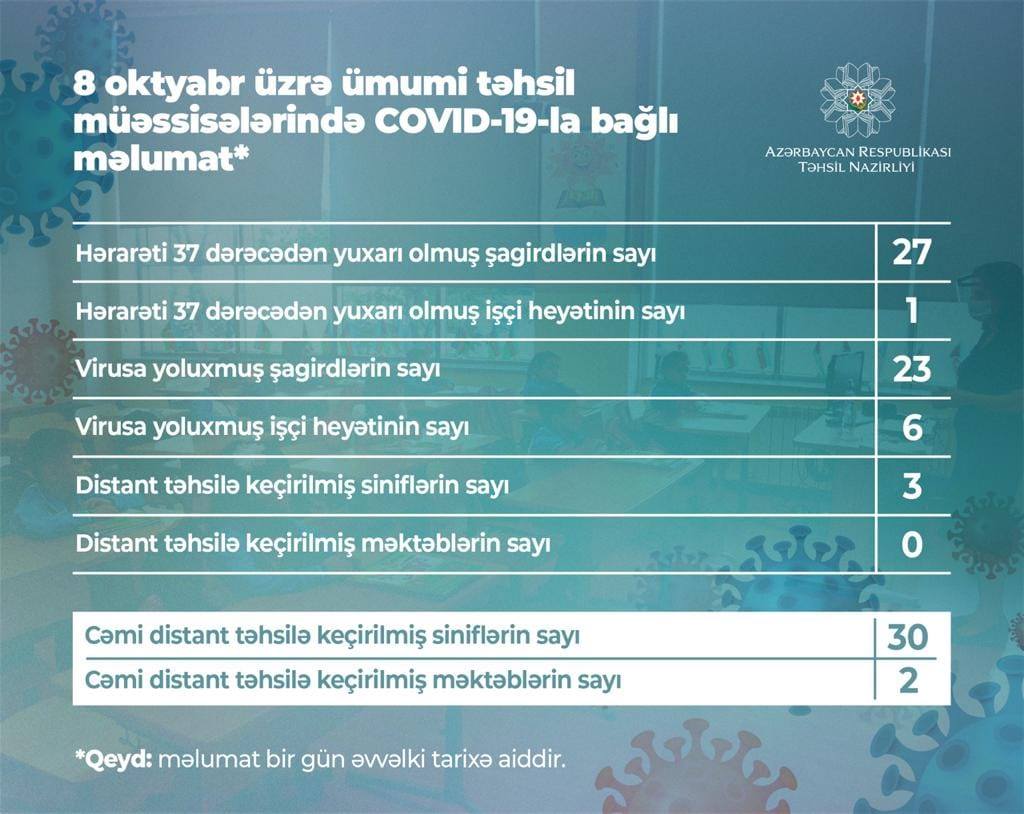 8 oktyabr üzrə ümumi təhsil müəssisələrində COVID-19-la bağlı məlumat açıqlanıb. Koronavirusa 23 şagird və 6 müəllim yoluxub.