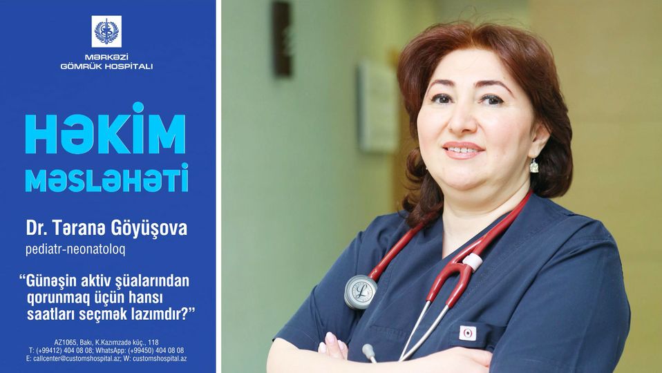 Aztibb.az xəbər verir ki, bu barədə Mərkəzi Gömrük Hospitalının pediatrı Təranə Göyüşova “Günəşin aktiv şüalarından qorunmaq üçün hansı saatları seçmək lazımdır?” mövzusundan bəhs edərkən deyib.