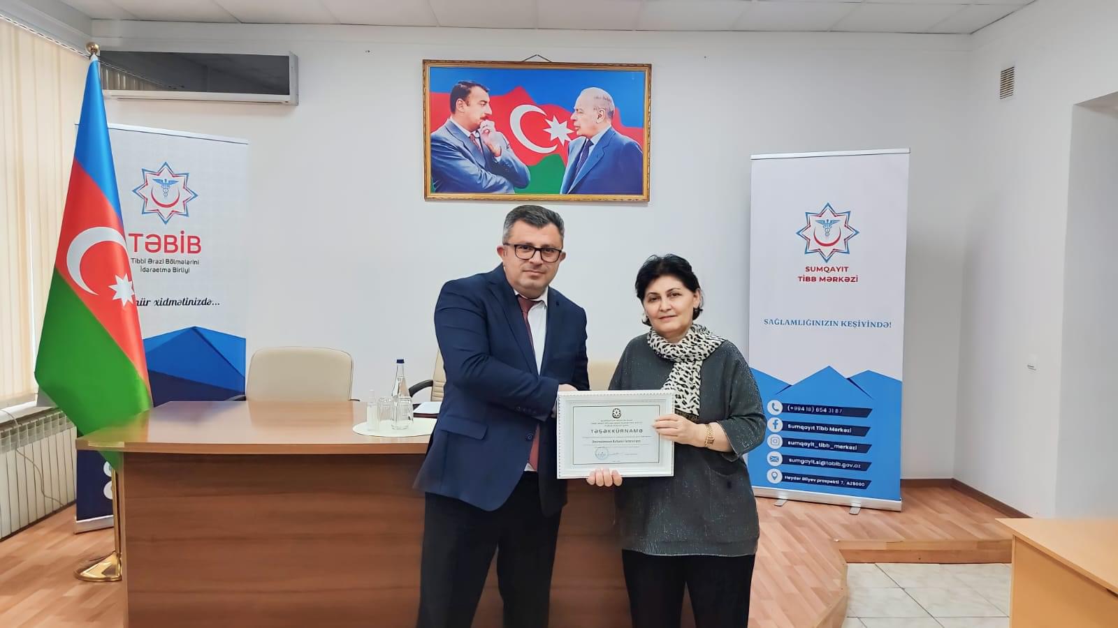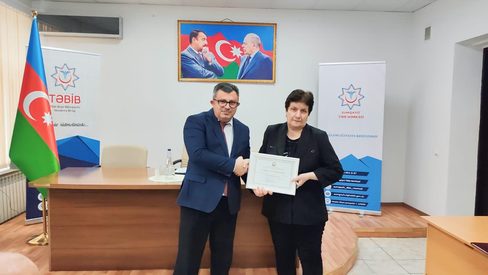Təşəkkürnamələri Sumqayıt Tibb Mərkəzinin direktoru Elnur Azadxanov təqdim edib. E.Azadxanov həkimləri təbrik edib və onlara gələcək fəaliyyətlərində uğurlar arzulayıb.