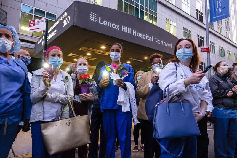 20 may 2020-ci il. Tibb bacıları, həkimlər, xidmət personalı və inzibatçılar “Lenox Hill” Hospitalının həyətində işıqları yandıraraq COVİD-19 infeksiyasından dünyasını dəyişmiş şəxslərin xatirəsini yad etdilər. (Ceff Baxner/”New York Daily News” üçün)