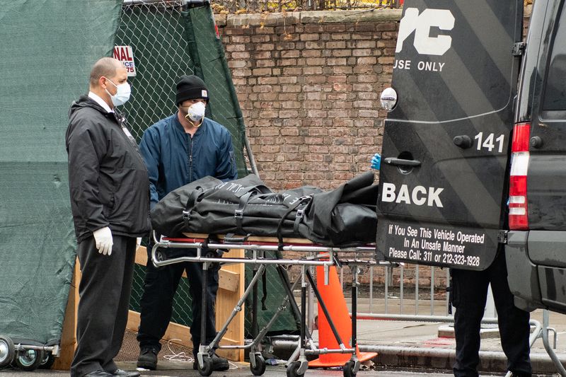 18 aprel 2020-ci il. Baş Tibbi Ekspertiza Bürosunun işçiləri vəfat edən şəxsin meyitini “Brooklyn” Hospitalının həyətindəki müvəqqəti morqdan götürürlər. (Teodor Parizien/”New York Daily News” üçün)