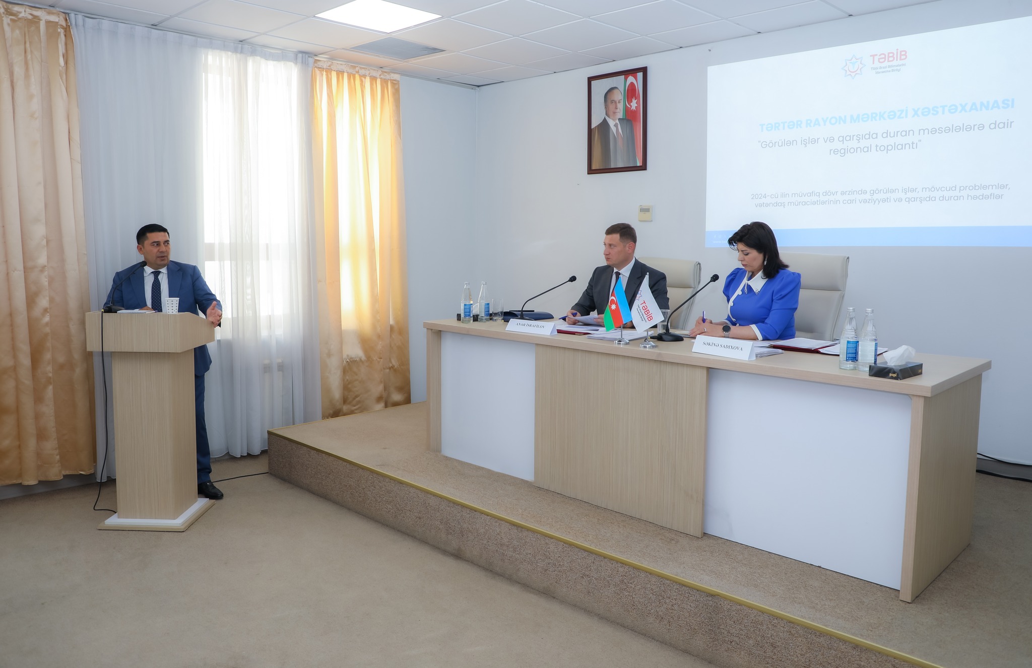 Yevlax Rayon Mərkəzi Xəstəxanasında keçirilən "Görülən işlər və qarşıda duran məsələlərə dair regional toplantı"da TƏBİB-in İcraçı direktorunun müavini Anar İsrafilov, İcraçı direktorun müşaviri Səkinə Sadıxova, qurumun aidiyyəti məsələlər üzrə şöbə müdirləri, Aran bölgəsi üzrə xəstəxana direktorları və digər rəsmi şəxslər iştirak edib.