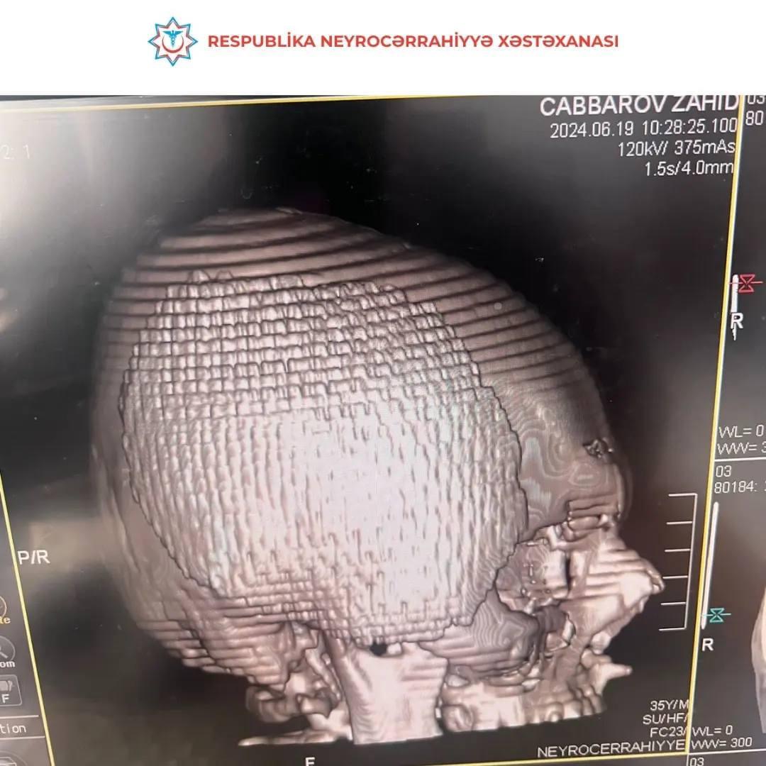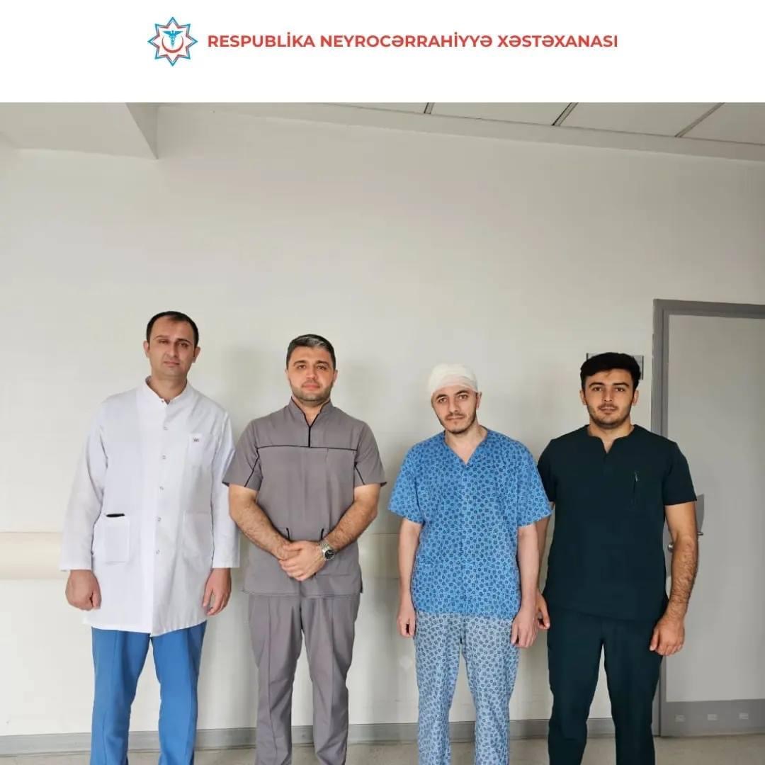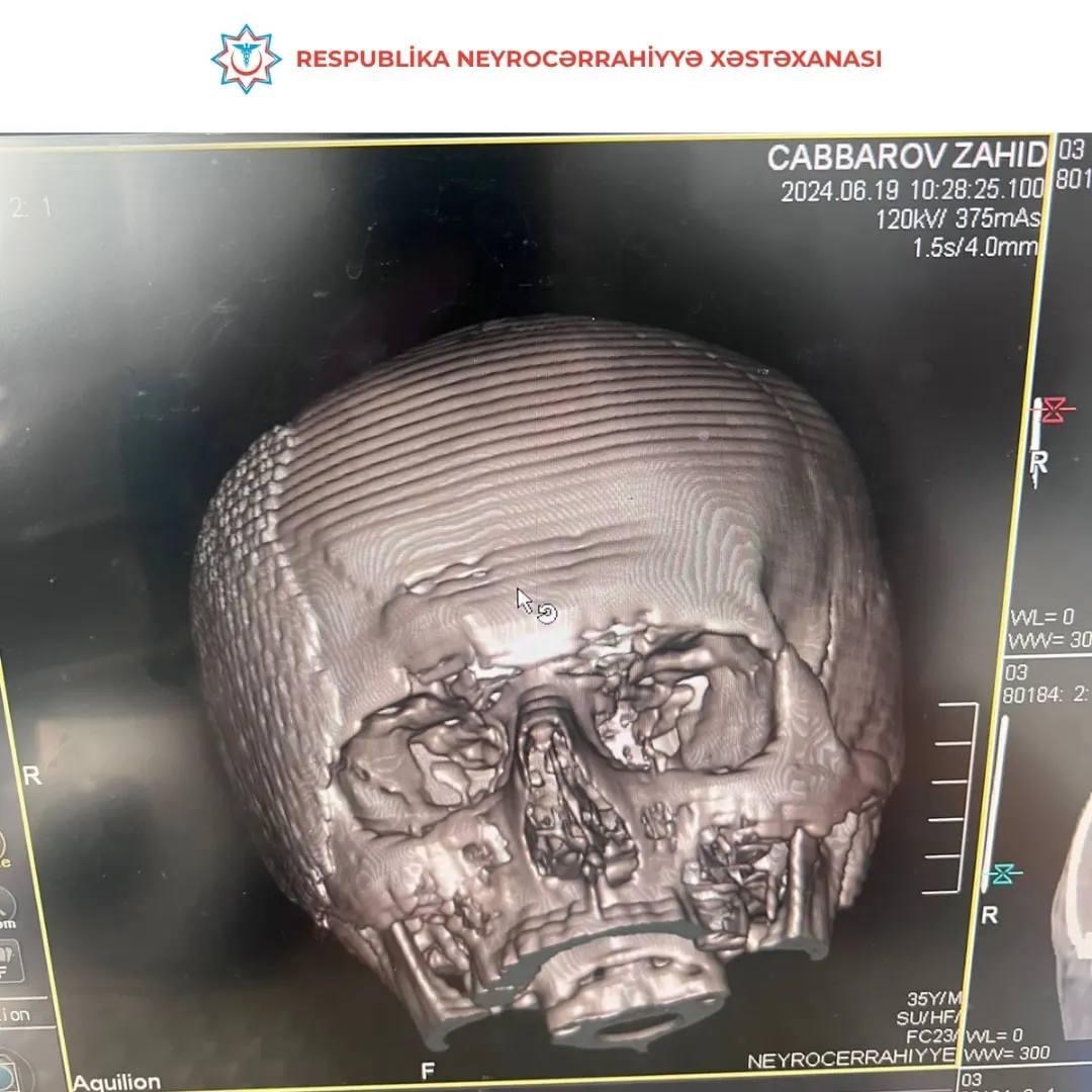 Zahid Cabbarov başındakı sümük defektinin bərpası üçün yenidən tibb müəssisəmizə müraciət edib və Nizami Məmmədov, Şamil Tahirov və Elman Cəfərov tərəfindən cərrahi əməliyyat olunaraq (sümük defekti titan lövhə ilə plastika olunub) nevroloji defisitsiz evə yazılıb.