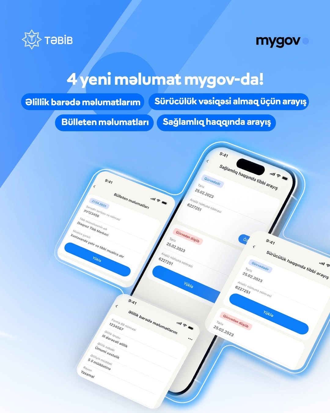 Tibbi məlumatların əhatə dairəsi “mygov” platformasında genişlənməyə davam edir. İcbari Tibbi Sığorta üzrə Dövlət Agentliyi, Tibbi Ərazi Bölmələrini İdarəetmə Birliyi (TƏBİB) və İnnovasiya və Rəqəmsal İnkişaf Agentliyinin birgə təşəbbüsü nəticəsində vətəndaşlar artıq bir sıra yeni tibbi məlumatlara - “Sağlamlıq haqqında tibbi arayış” və “Sürücülük vəsiqəsi almaq üçün tibbi arayış”a “mygov” platforması üzərindən baxa və rəqəmsal (PDF) formada əldə edə bilirlər. Əvvəllər yalnız “e-Tabib” mobil tətbiqi vasitəsilə və ya fiziki şəkildə əldə edilə bilən bu məlumatlara indi "mygov" veb portalı və mobil tətbiqi üzərindən təhlükəsiz və operativ şəkildə çıxış imkanı yaradılıb.