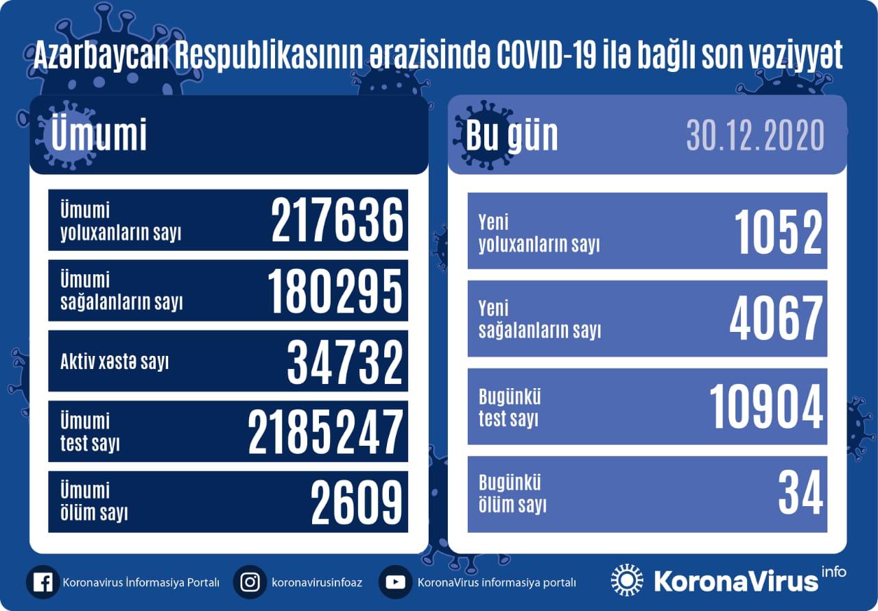 Azərbaycanda bu gün koronavirus infeksiyasına 1052 yeni yoluxma faktı qeydə alınıb, 4067 nəfər müalicə olunaraq sağalıb və evə buraxılıb.