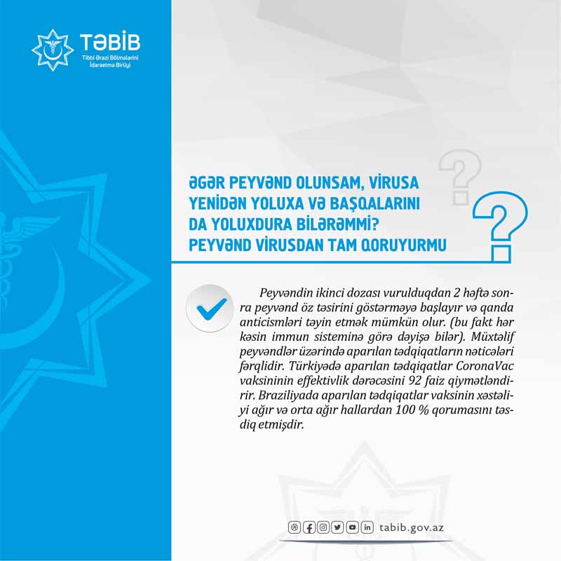 TƏBİB-dən bildirilib ki, peyvənd ikinci doza vurulduqdan iki həftə sonra öz təsirini göstərməyə başlayır və qanda anticisimləri təyin etmək mümkün olur. Bu, hər kəsin immun sisteminə görə dəyişə bilər.