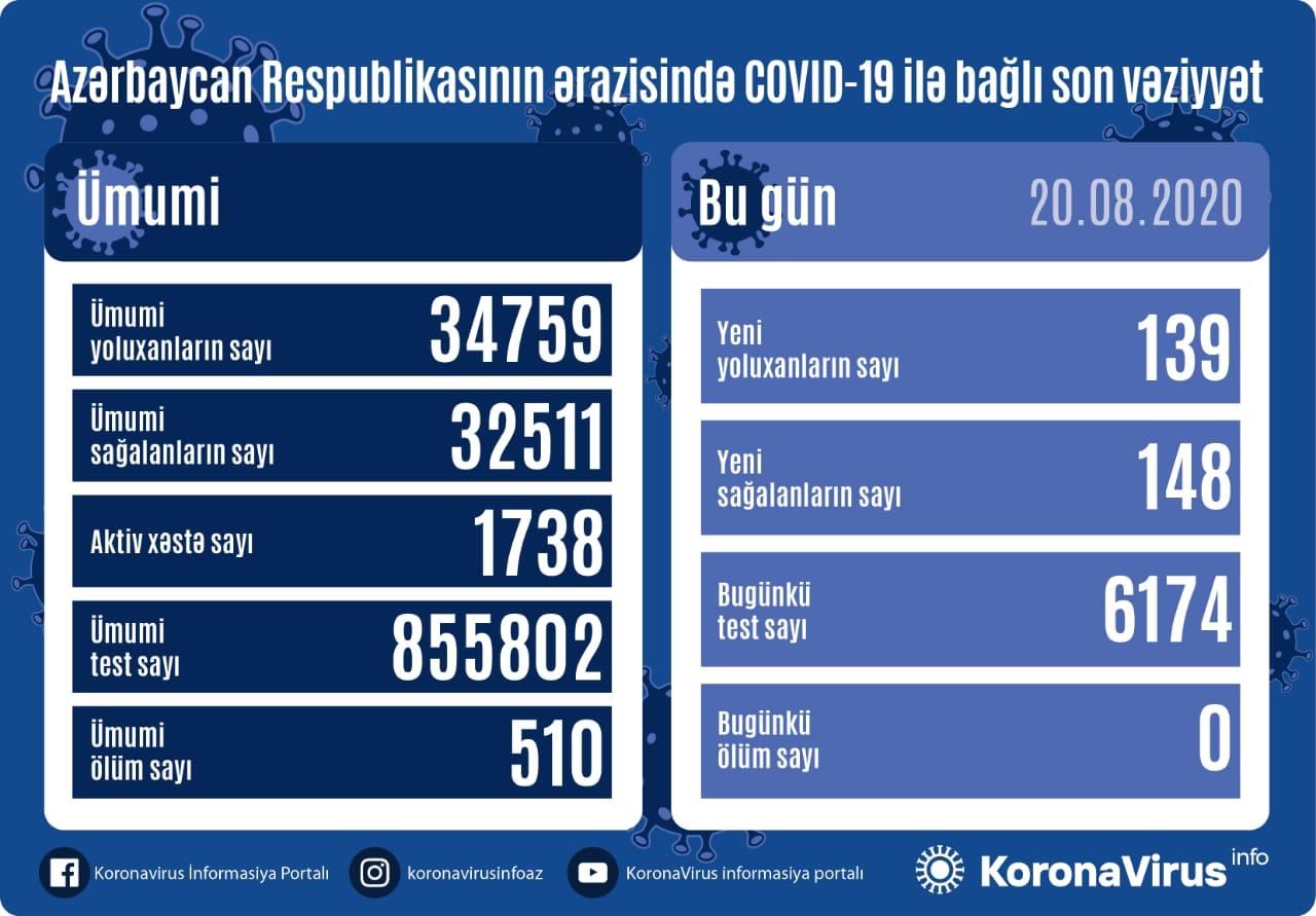 Azərbaycan Respublikasında koronavirus (COVID-19) infeksiyasına 139 yeni yoluxma faktı qeydə alınıb, 148 nəfər müalicə olunaraq sağalıb və evə buraxılıb.